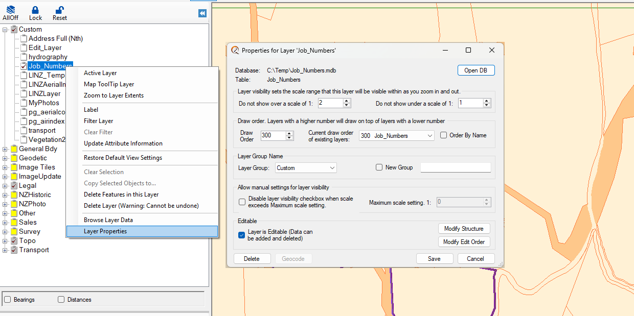 The layer properties form is used to set which scale range the layer is visible at by default, and what group the layer sits under in the layer control tool.