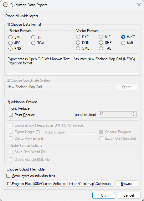 Most property and Topographic data in Quickmap may be exported from Quickmap in a wide range of raster and vector file formats, and freely distributed in other software packages. Data may be exported in over 60 different Coordinate Systems for export. The Export tool is activated by selecting File> Export off the menu.