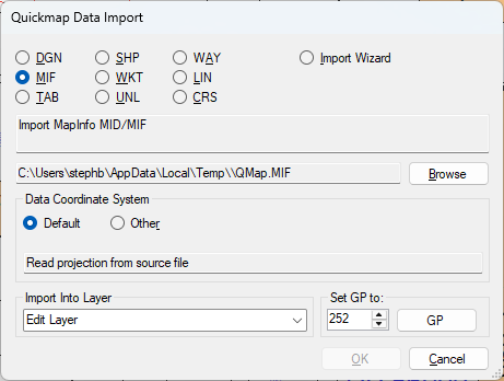 WAY  Supported for import. The WAY file is an ASCII Vector format file. If your GPS does not support NMEA protocol, or cannot download waypoints using NMEA then you can still download the data from your GPS unit by Importing a waypoint file.To download waypoints from a waypoint file: Download GPS TrackMaker from www.gpstm.com (this software will support almost every GPS unit interface). Using this free software save your GPS data as a waypoint file. From Quickmap select File>import and you will be presented with the following import box that will enable you to browse to your waypoint file and then import it.