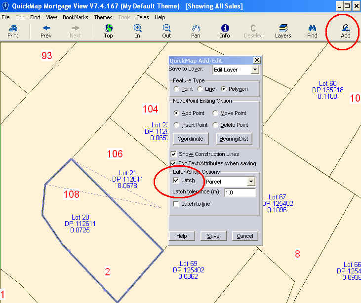 To add data to a custom layer in Quickmap, click on the Add button along the top tool bar, choose your feature type, Point, Line or Polygon. If you wish to latch onto the boundary points, tick on the Latch button within the QuickMap Add/Edit dialogue box.