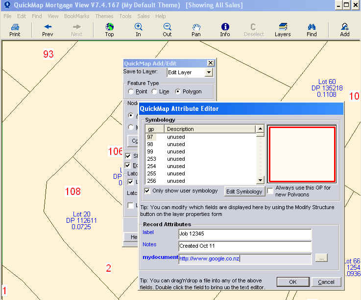 Add a label (i.e. Job Number) which can be shown and printed on the QuickMap and any relevant Notes (which will not be shown or printed). Hyperlinks to documents relating to the area can be added to mydocuments in the Edit Layer dialogue box.