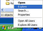 - When you have determined the location of the data folder, exit QuickMap then run explorer by right mouse clicking on the Start button and choosing Explore from the menu.