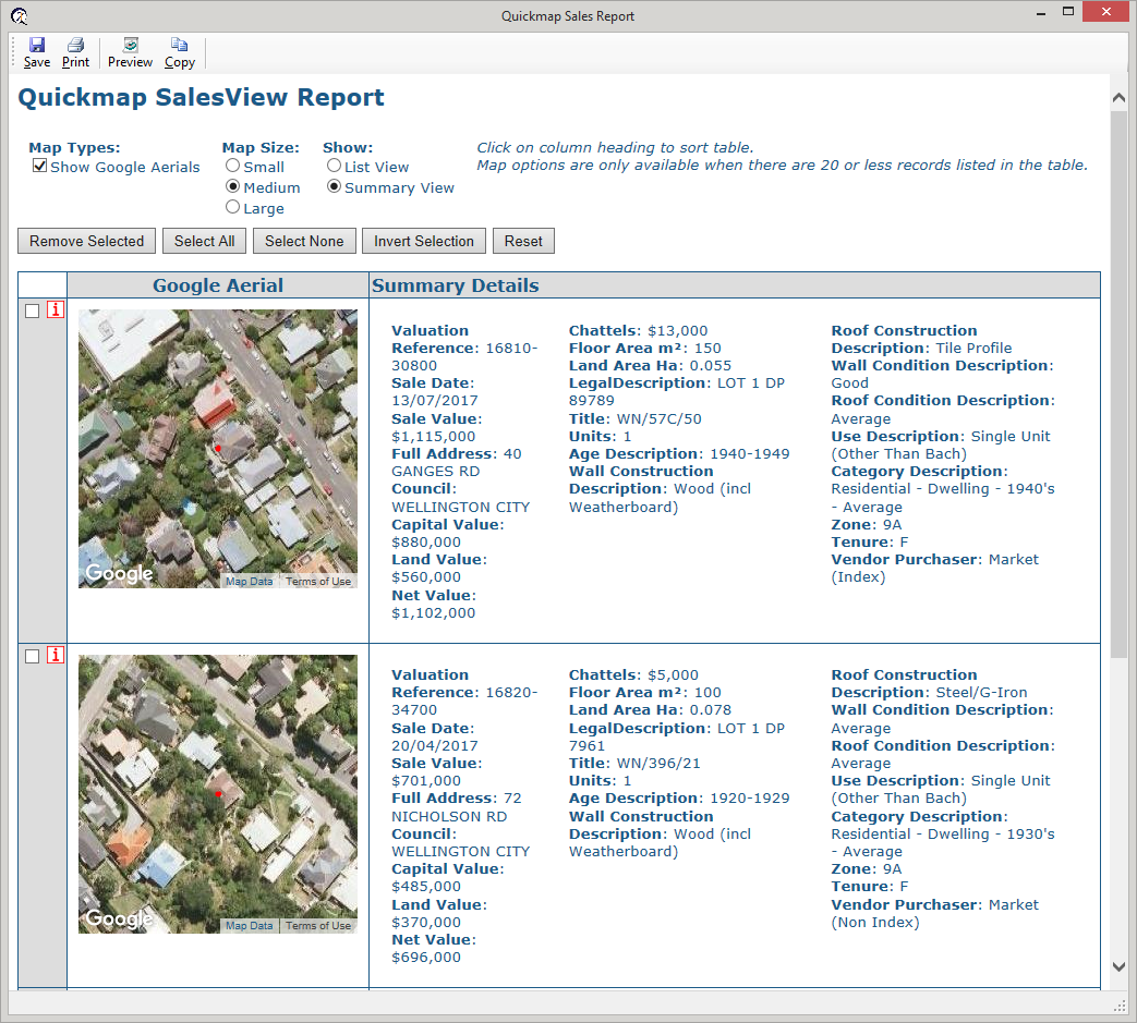 The rateable value (RV), which is the value set by the local authority or council in order to determine rates for a property is part of the DVR record, and included with Quickmap® Enterprise by default, and all other DVR data is provided with the Salesview expansion pack. Legal,parcel and other details that form part of Quickmap® Enterprise are integrated into reports generated from Quickmap® Salesview.