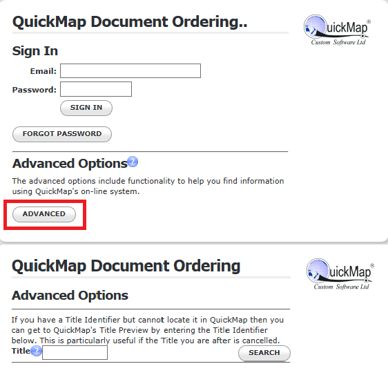 If you have a Title Identifier but cannot locate it in Quickmap, this may mean that the title has either been cancelled and is no longer live, or that it is newly issued. In this case, you can try to find the Title using the Advanced Search option, which is accessed via My Document Ordering Dashboard.