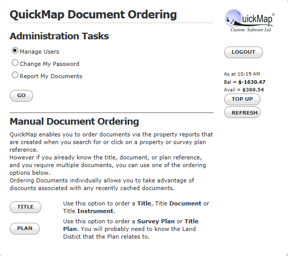 From ‘Manage Users’ you can add, edit and remove users and you can choose whether or not they are assigned as an administrator or normal user. An administrator is able to create, modify and delete other users, top-up accounts and report documents ordered. A normal user is simply able to order documents.