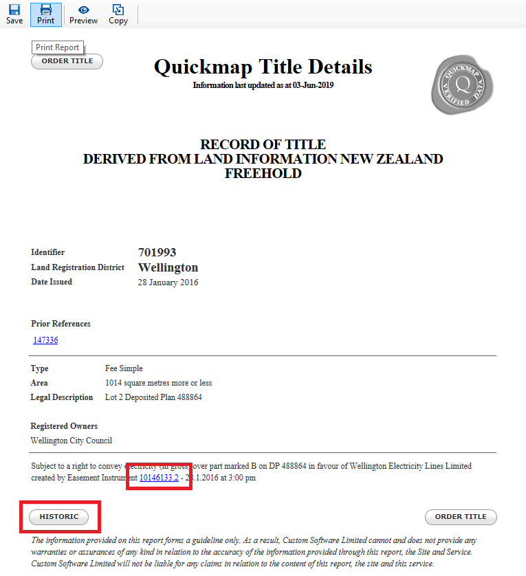 At the bottom of the Title Preview you will see a list of the associated instruments. To see the historic memorials, click on the ‘Historic’ button. Click on the blue hyperlink to order the instrument or memorandum.