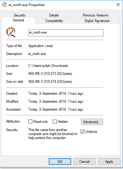 To fix this you can either cancel the pop up and run it again, or right click the exe file and tick the “Unlock” checkbox at the bottom of the window, then click OK.