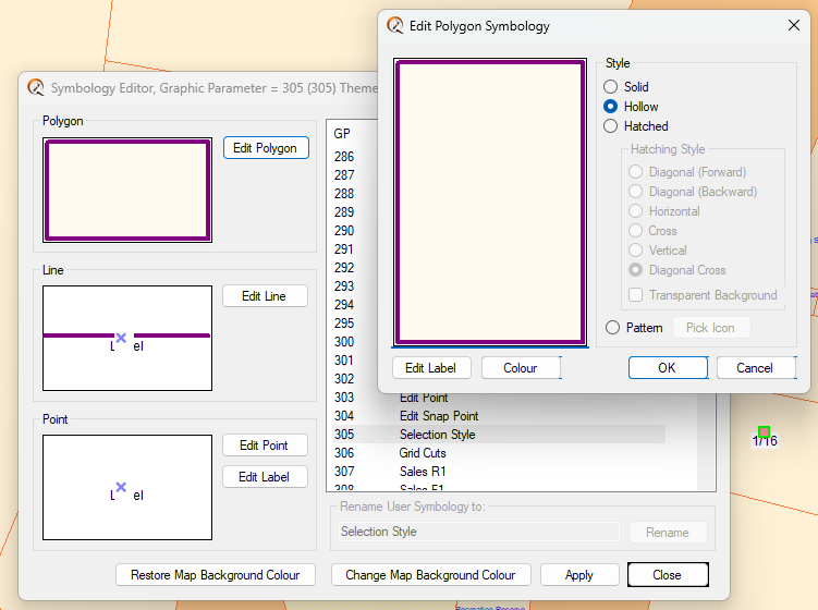 When the Symbology Editor form is displayed, scroll down to and click on GP 305 in the list and then choose Edit Polygon.