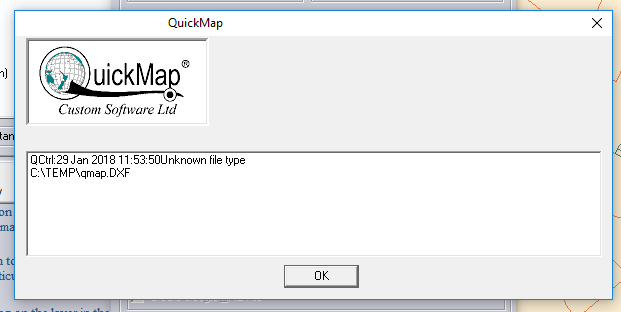When exporting to DXF in Quickmap you can get this error: QCtrl: Unknown file type C:\TEMP\qmap.dxf The Unknown file type error can be caused by a permission problem when exporting. Try changing the path to fix this. Please like this page: